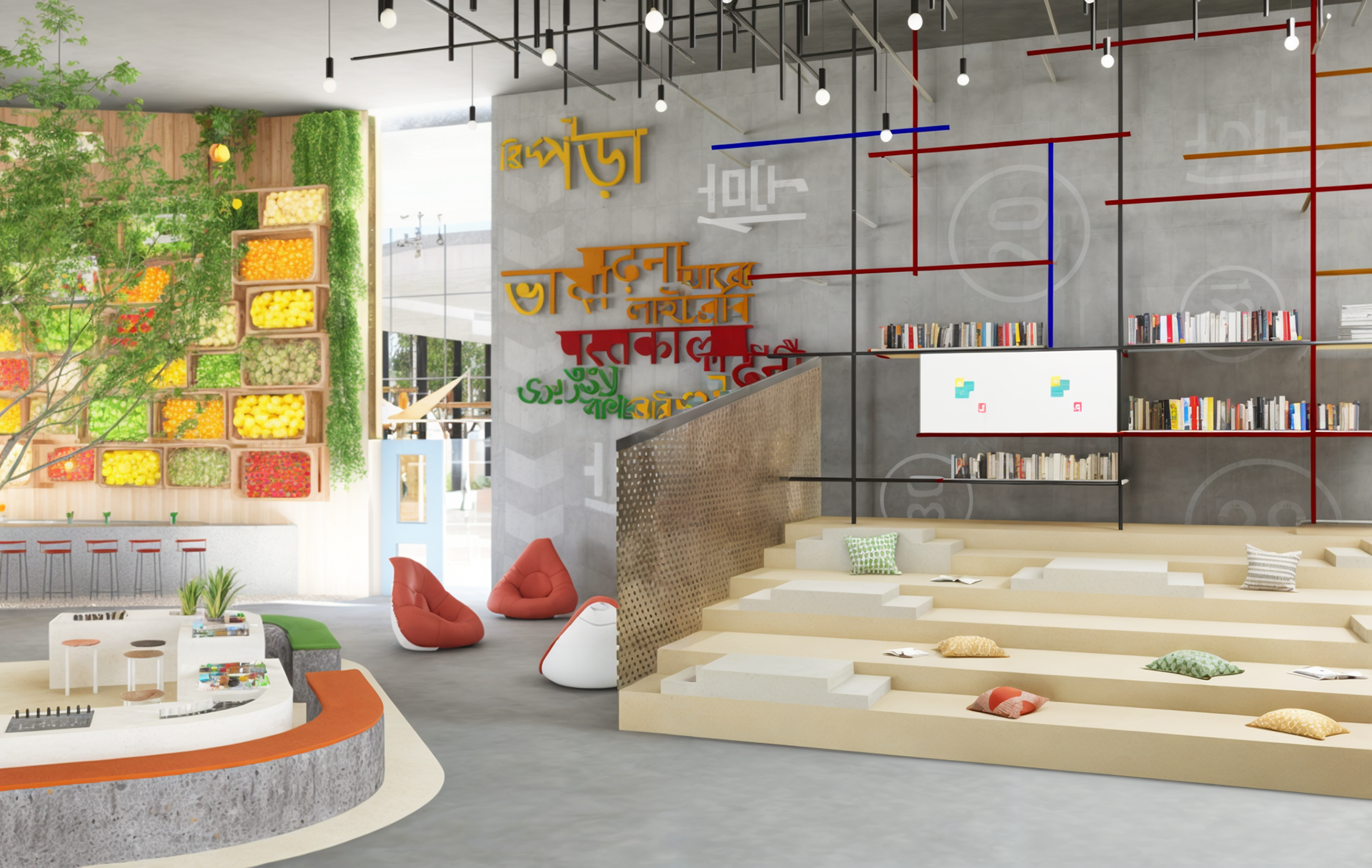 All materials used in this community space were sourced from waste generated at construction sites and repurposed to build and furnish the space—emphasizing a strong commitment to sustainability and resource-conscious design.